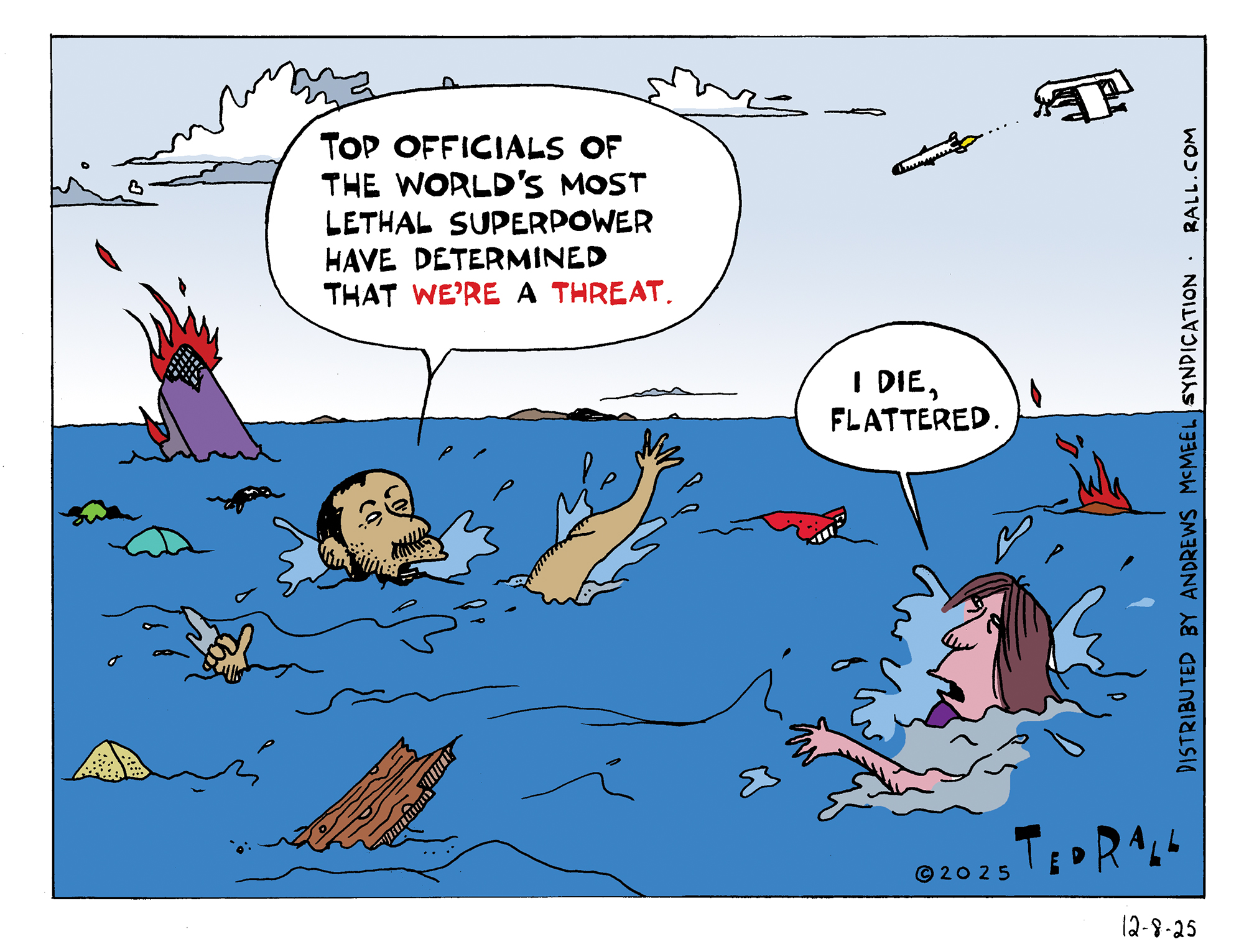 The U.S. Department of Defense has assassinated at least 87 Venezuelan nationals, alleging that they were drug traffickers, by blowing up their vessels on the high seas. In one incident, two out of eleven crew members survived the initial attack. Forty-one minutes later, U.S. forces decided to kill the survivors. The Trump administration claimed that, even though the two men were in the middle of the ocean clinging to debris and not even wearing shirts, they still posed a threat to the United States and its national security interests.