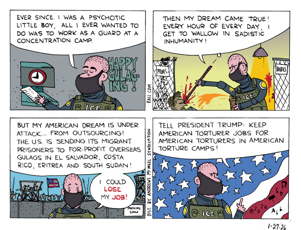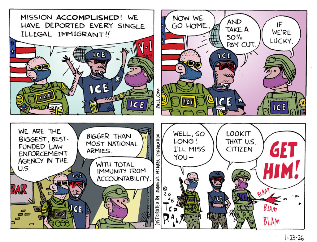 ICE agents and their supporters portray them as big and brave. The truth is, they’re fragile snowflakes who complain about being called names, the cold in Minnesota, and having demonstrators throw empty water bottles and snowballs at them. Most absurdly, they wear masks for fear of being doxxed, while every other state and local cop and federal LEO has their identity in open view. ICE are vicious. But they’re also cowards.