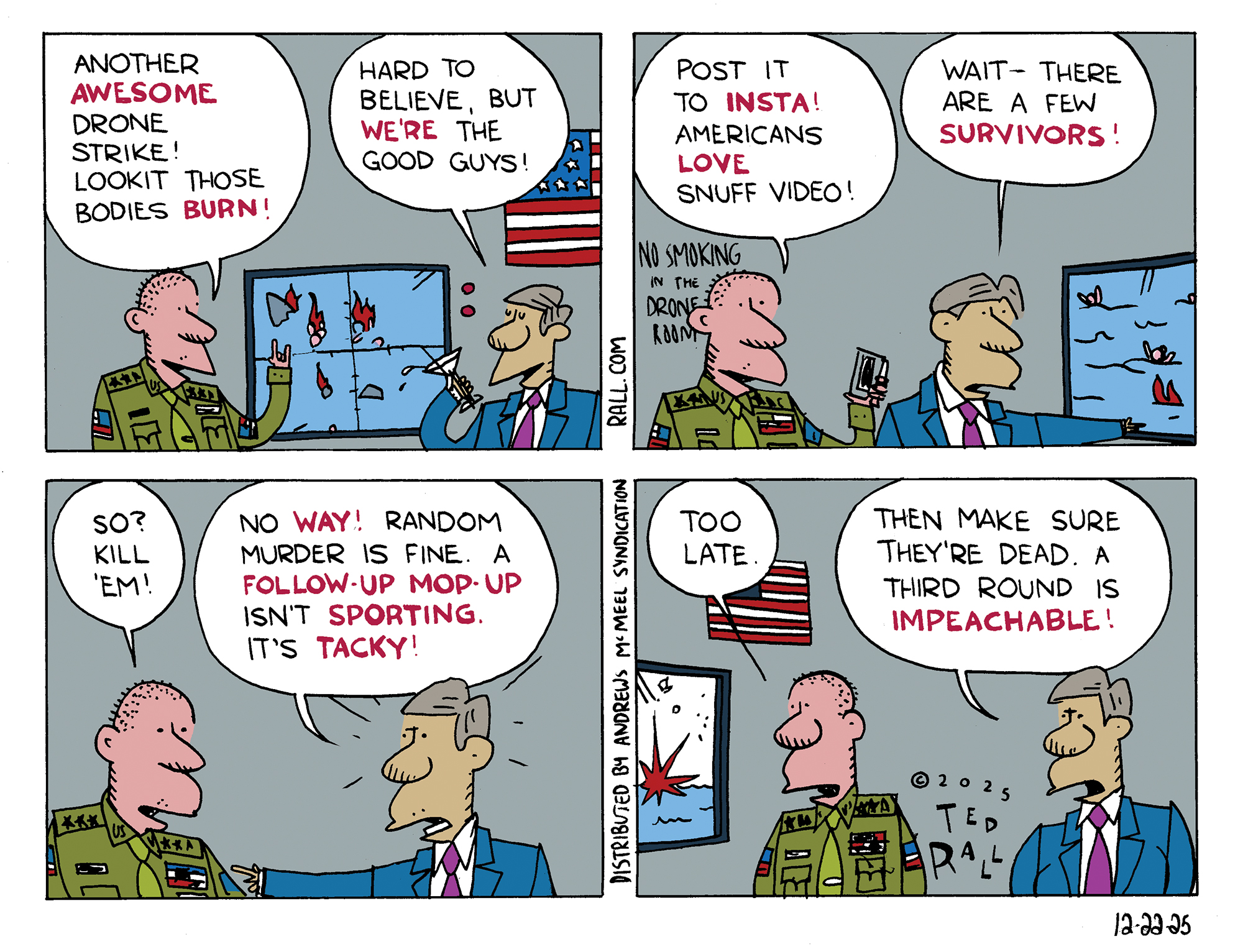 Presidents of both parties have assassinated thousands of innocent people all around the world with drones. The latest iteration of these extrajudicial killings is Trump’s campaign against so-called narco-terrorists in the southern Caribbean, who are carrying cocaine to Africa and Europe, not the United States. But the incident that attracted criticism and investigations was the DOD’s decision to kill a pair of survivors of one such strike off the coast of Venezuela.