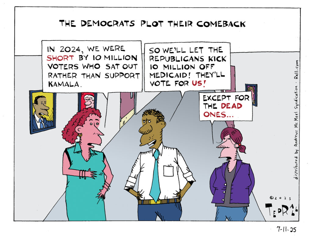 The Republicans’ Big Beautiful Bill Act will cause at least 10 million Americans to lose their healthcare coverage due to sweeping budget cuts to slash taxes for corporations and wealthy individuals. That’s very close to the number of 2020 Biden voters who refused to turn out for Kamala Harris in 2024. Would they turn out for a Democrat in 2028 to express their displeasure? Not if the loss of healthcare has the desired effect.
